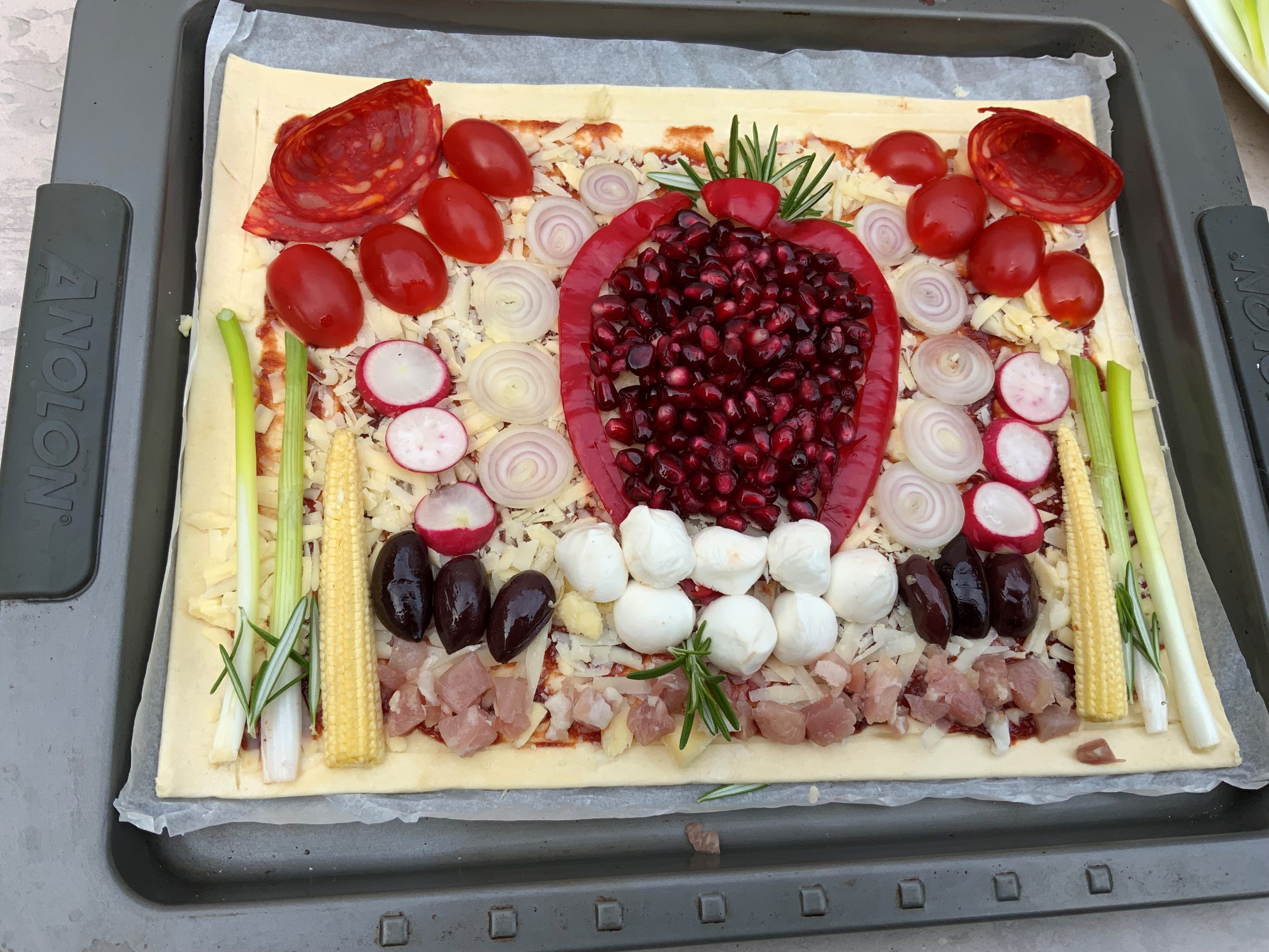 Arrange remaining vegetables into flowers or shapes across the pastry